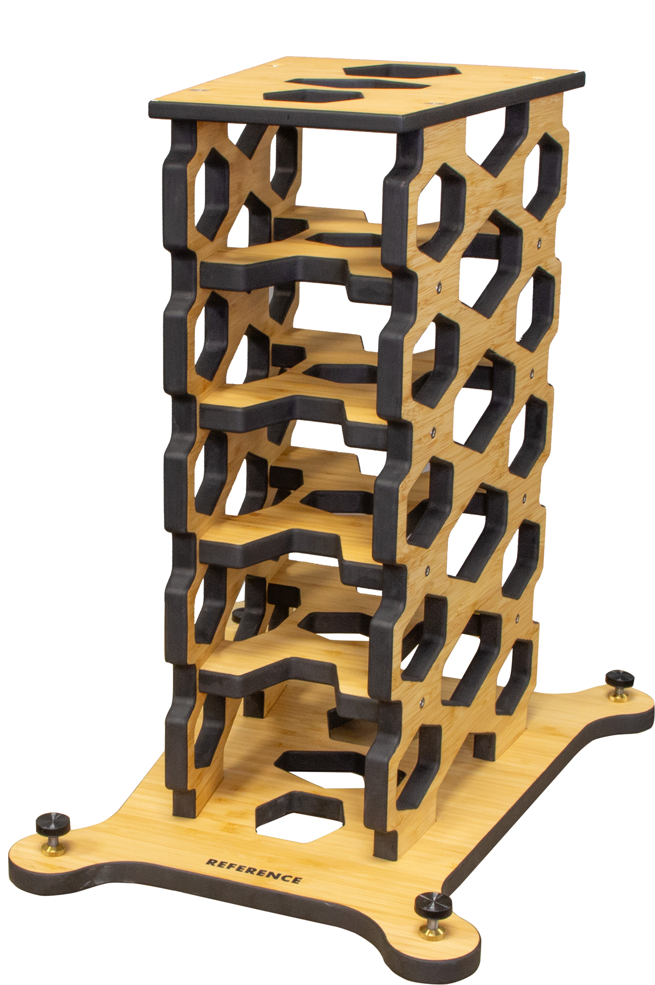 Crafted with high-quality, solid 3-ply bamboo, cured and precision CNC fabrication in-house. The lateral bracing to ensures rigidity, stability and resistance to warping. Bamboo is selected for its density, and resonance control which lends a natural harmonic contribution to the speaker sound. The adjustable bronze spikes also provide stability and manage vibration transfer.